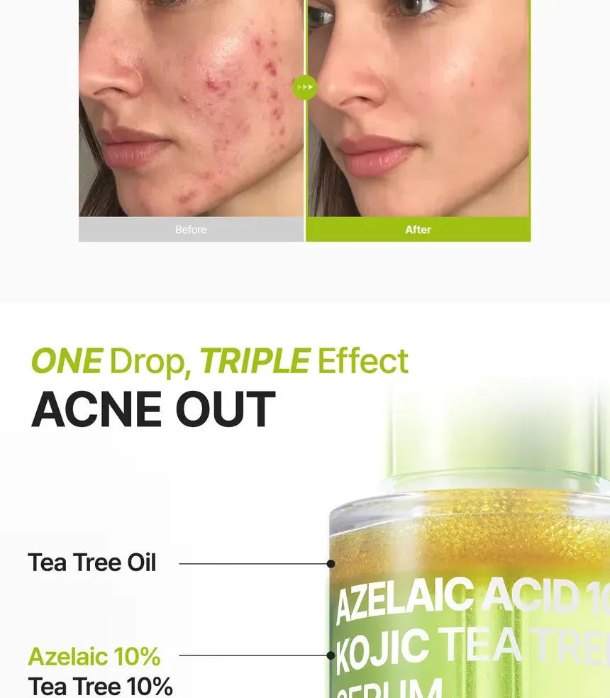 - تقليل حب الشباب والعيوب: يساعد حمض الأزيليك وزيت شجرة الشاي بفعالية في تنقية المسام ومكافحة البكتيريا المسببة لحب الشباب، مما يقلل من ظهور البثور والرؤوس السوداء والبيضاء.