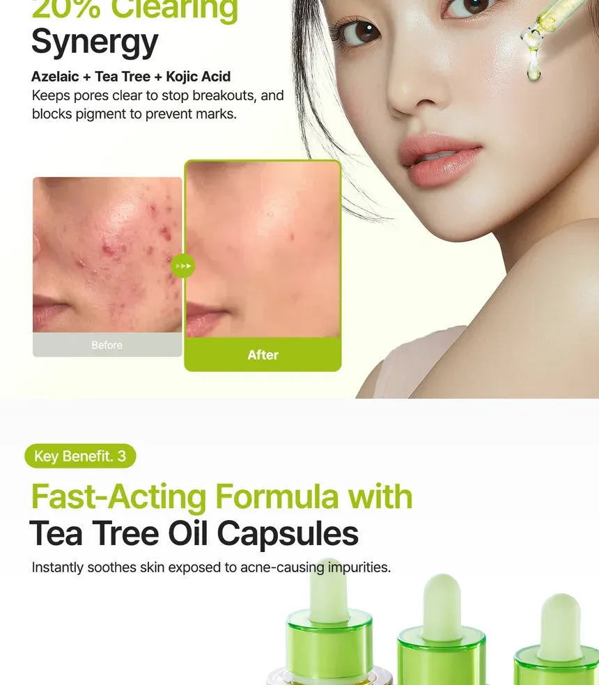 - فعالية مثبتة علمياً: يجمع بين ثلاثة مكونات نشطة قوية وفعالة (حمض الأزيليك، حمض الكوجيك، زيت شجرة الشاي) في معالجة مشاكل البشرة المتعددة بشكل شامل.