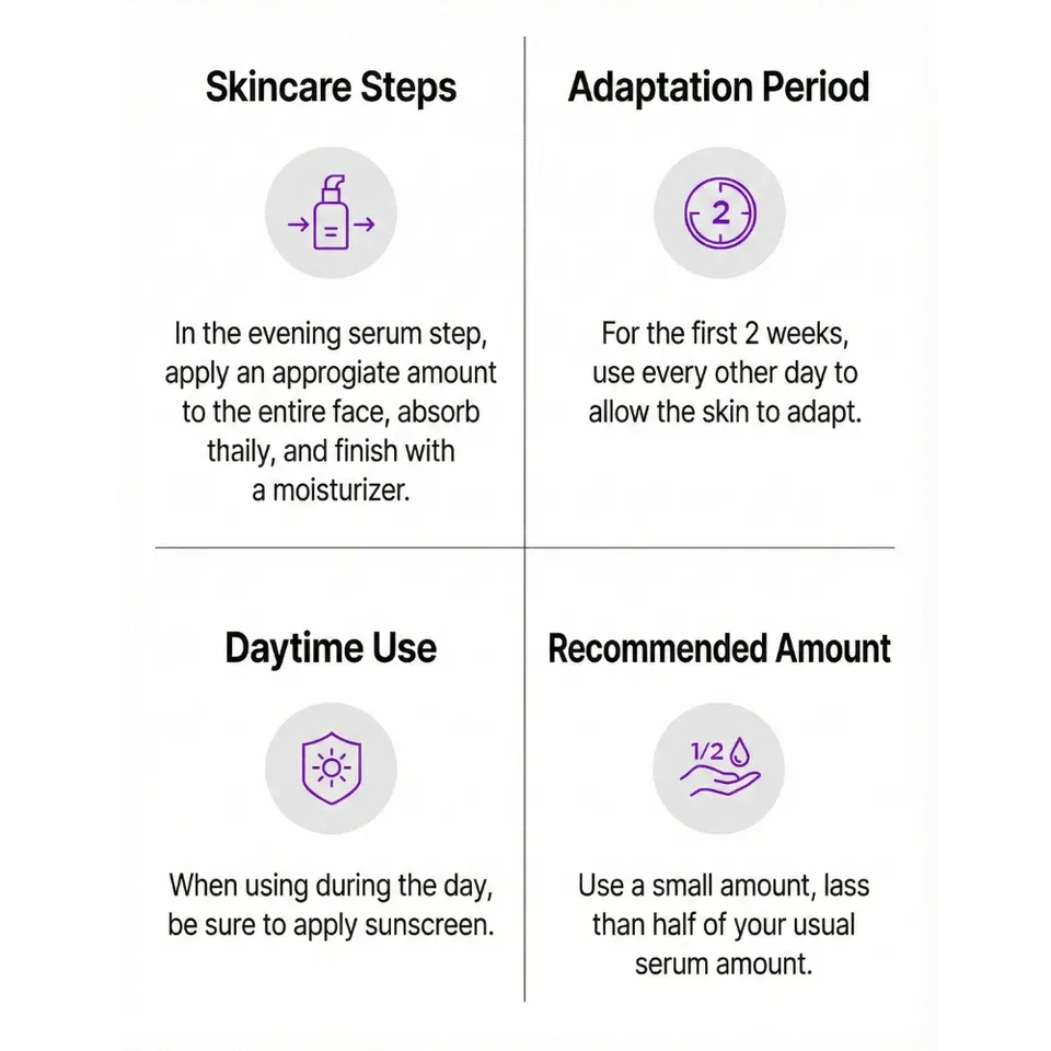 For best results, introduce the ANUA Retinol 0.3 Niacin Renewing Serum gradually into your evening routine.