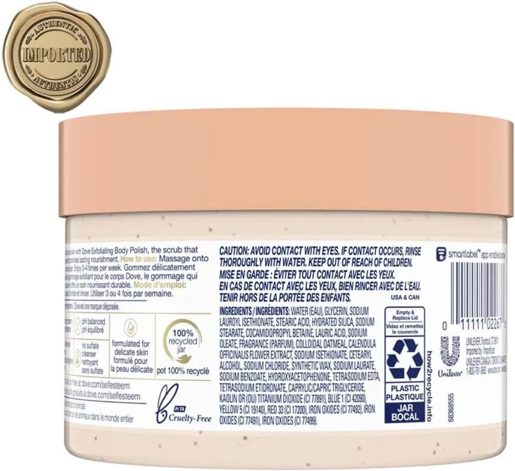 - The Dove Colloidal Oatmeal & Calendula Oil Exfoliating Body Polish stands out due to its unique blend of gentle exfoliation, Dove's 1/4 moisturizing cream, and the soothing power of colloidal oatmeal and calendula oil. It not only removes dead skin cells but also deeply nourishes and calms the skin, preventing dryness and irritation often associated with other scrubs.