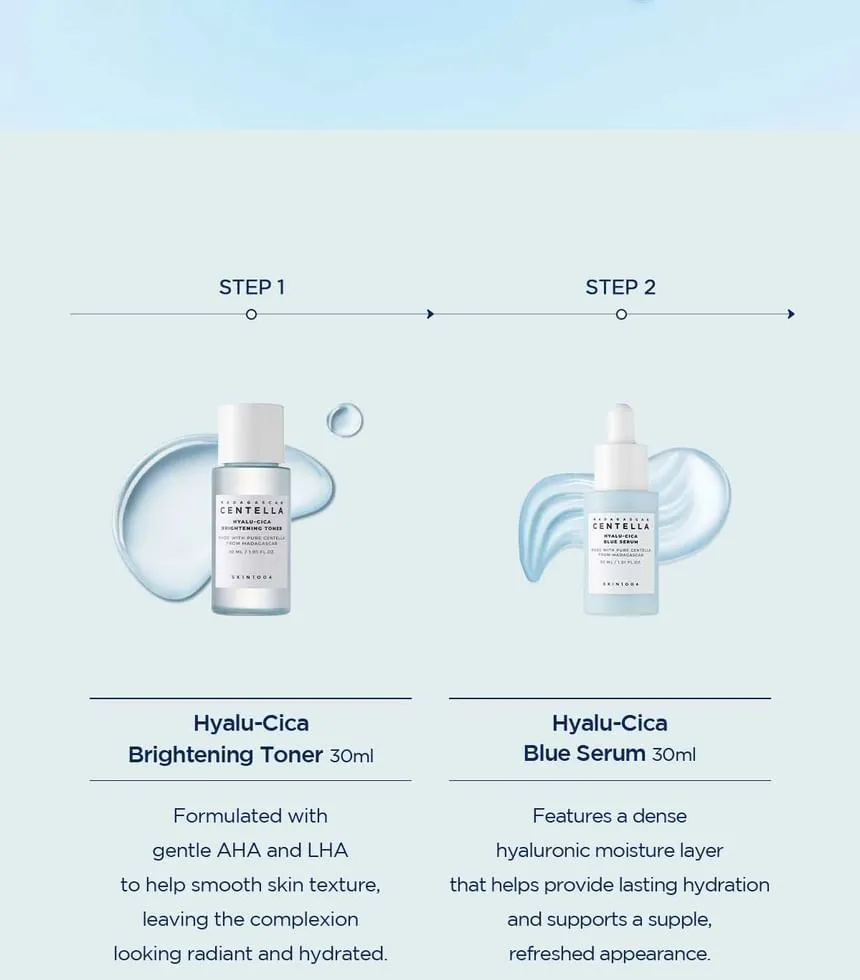 - Hyalu-Cica Brightening Toner (30ml): A refreshing, non-irritating toner that gently exfoliates dead skin cells while instantly infusing moisture, preparing your skin to absorb subsequent products.
