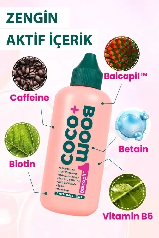 COCO BOOM Anti Hair Loss Hair Strengthening Tonic هو تونيك شعر طبيعي يساعد على منع تساقط الشعر وتعزيز نمو الشعر. يتكون من مزيج من المكونات الطبيعية ، بما في ذلك بايكابيل ، بيوتين ، وس palmetto ، والتي ثبت سريريًا أنها فعالة في تحفيز نمو الشعر.